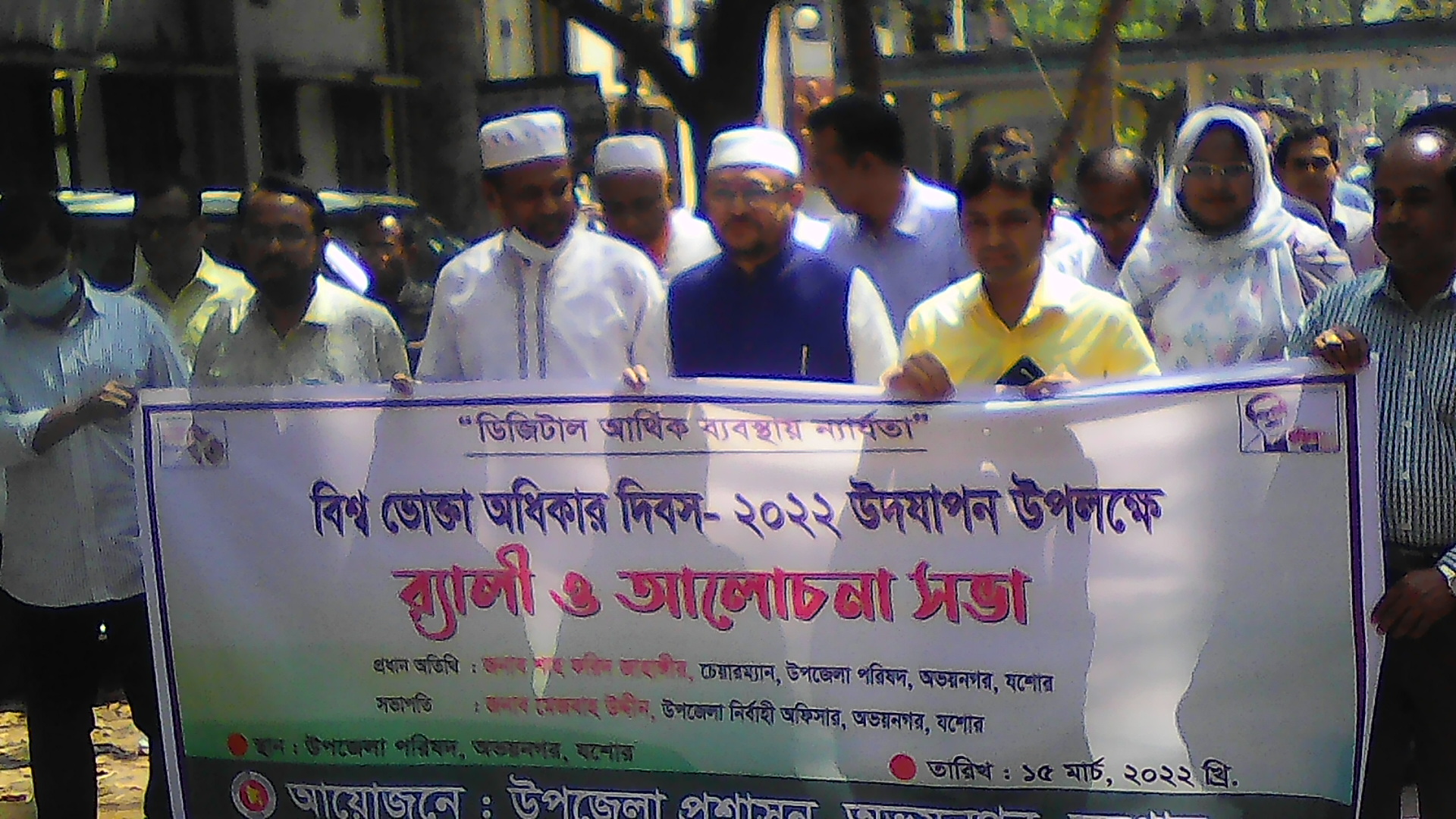 স্টাফ রিপোর্টার:অভয়নগর উপজেলা পরিষদের আয়োজনে বিশ্ব ভোক্তা অধিকার দিবস উদযাপিত হয়েছে। এ উপলক্ষে মঙ্গলবার সকালে উপজেলা পরিষদ মিলনায়তনে এক আলোচনা সভা অনুষ্ঠিত হয়। উপজেলা নির্বাহী অফিসার মেজবাহ উদ্দিনের সভাপতিত্বে অনুষ্ঠিত সভায় প্রধান অতিথির বক্তব্য রাখেন উপজেলা চেয়ারম্যান শাহ ফরিদ জাহাঙ্গীর। এছাড়া অন্যান্যর মধ্যে বক্তব্য রাখেন উপজেলা মৎস্য কর্মকর্তা ফারুক হোসেন সাগর, নওয়াপাড়া সরকারি কলেজের অধ্যাক্ষ রবিউল হাসান, থানার অফিসার ইনচার্জ (তদন্ত) মিলন কুমার মন্ডল প্রমুখ। এর আগে একটি একটি র্যলি উপজেলা চত্বর প্রদক্ষিণ করে।