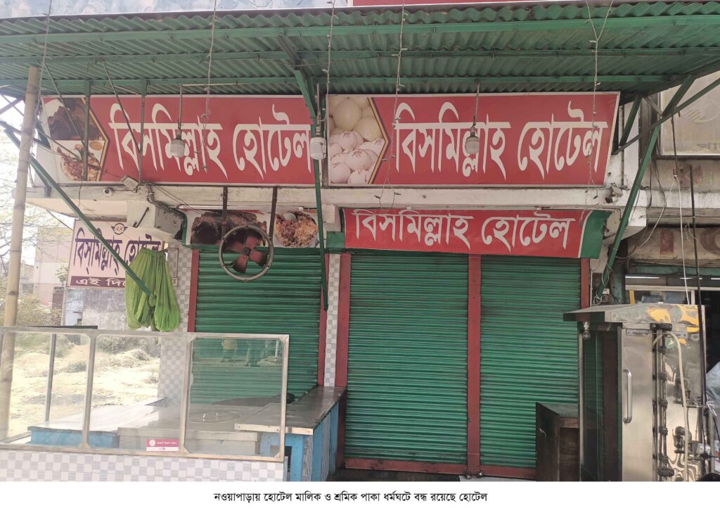 স্টাফ রিপোর্টার: নওয়াপাড়ায় হোটেল কর্মচারী ওপর সন্ত্রাসীদের হামলার ঘটনায় সকল হোটেল বন্ধ রেখে মালিক শ্রমিক মিলে সন্ত্রাসীদের গ্রেফতারের দাবিতে ৪৮ ঘন্টা যাবৎ ধর্মঘট অব্যাহত রেখেছেন। তারা ঘটনার সাথে জড়িত সকল আসামী গ্রেফতার না হওয়া পর্যন্ত আন্দোলন চলবেন বলে জানিয়েছেন।