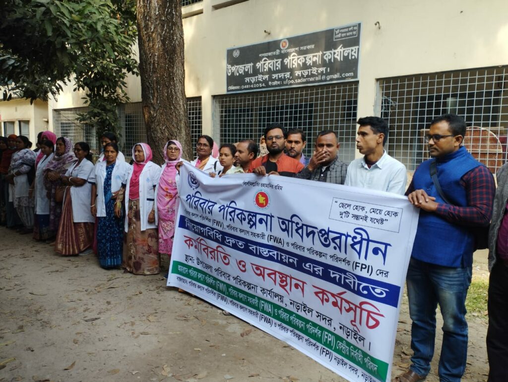 নড়াইলে পরিবার কল্যাণ পরিদর্শিকা (FWV), পরিবার কল্যাণ সহকারী (FWA) ও পরিবার পরিকল্পনা পরিদর্শক (FPI) দের নিয়োগবিধি দ্রুত বাস্তবায়ন এর দাবীতে কর্মবিরতি ও অবস্থান কর্মসূচি শুরু হয়েছে।