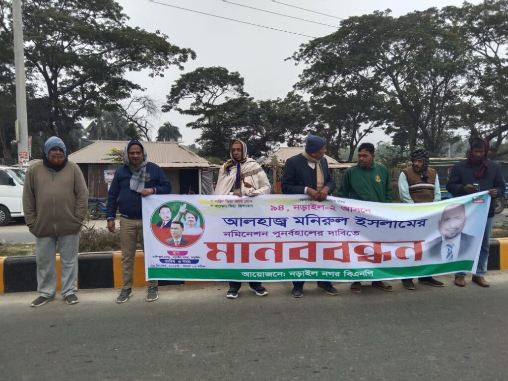 নড়াইল-২ আসনে জেলা বিএনপির সাধারণ সম্পাদক আলহাজ্ব মো. মনিরুল ইসলামের দলীয় মনোনয়ন পুনর্বহালের দাবিতে নড়াইলে মানববন্ধন ও বিক্ষোভ সমাবেশ অনুষ্ঠিত হয়েছে।