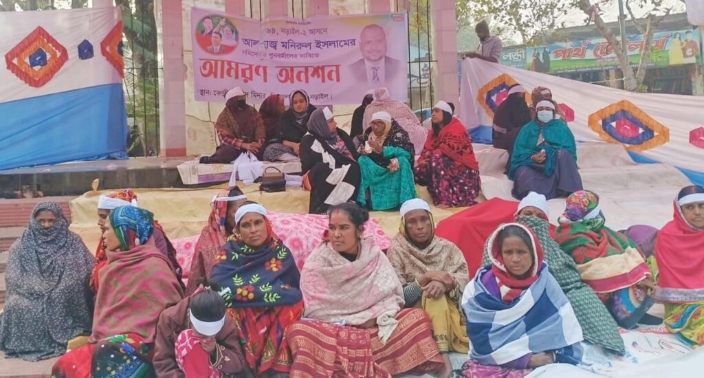 সরেজমিনে জেলা শিল্পকলা একাডেমির সামনে কেদ্রীয় শহিদ মিনারে গিয়ে দেখা যায়,‘নড়াইল সদর থানা মহিলা দলের সহ-সভানেত্রী শিরিন সুলতানার নেতৃত্বে এ আমরন অনশন শুরু করেন। প্রথমে ৪ জন অনশন শুরু করলেও সময়ের সঙ্গে সঙ্গে অর্ধশতাধীক সমর্থক এ অনশনে যোগ দেন। প্রচন্ড শীতে আমরন অনশনে থাকা ৪ জন গুরুতর অসুস্থ হয়ে পড়েন। অসুস্থদের চিকিৎসা দেয়া হয়। অসুস্থ ১জনকে স্যালাইন দেয়া হয়েছে। অনশন কর্মসূচি’র খবর পেয়ে রাতেই মোঃ মনিরুল ইসলাম সেখানে ছুটে যান। এসময় অনশনরতদের পানি এবং শরবত খাইয়ে অনশন ভাঙতে অনুরোধ করলেও তারা সরে যাননি।,