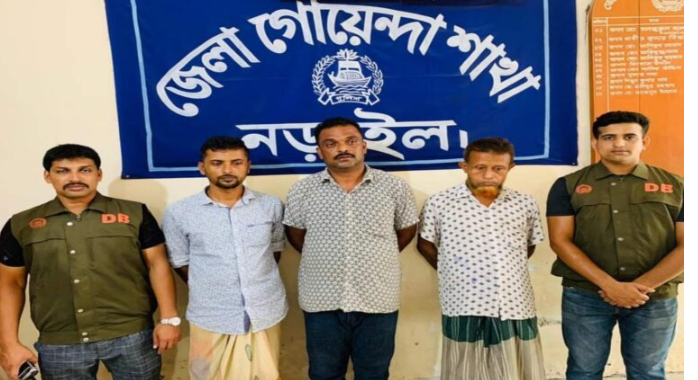 নড়াইল জেলা গোয়েন্দা পুলিশ (ডিবি’র) অভিযানে জুয়ার সরঞ্জামসহ ৩ জুয়ারিকে গ্রেফতার করা হয়েছে। (১১ জুন) রবিবার বিকালে নড়াইল সদর থানাধীন সীমাখালী বিলের মধ্য থেকে তাদের গ্রেফতার করা হয়। ডিবি পুলিশ পরিদর্শক সাজেদুল ইসলাম এর তত্ত্বাবধানে এসআই জয়দেব কুমার বসু সঙ্গীয় ফোর্সসহ অভিযান চালিয়ে জুয়ারিদের গ্রেফতার করে। গ্রেফতারকৃত আসামি,নড়াইল সদর উপজেলার বেদভিটা গ্রামের মৃত-ফুল মিয়া শেখের ছেলে বাদশা মিয়া (৫৫) একই গ্রামের ওসমান গনি বিশ্বাসের ছেলে বিকুয়ার বিশ্বাস (৪০) ও একই উপজেলার বল্লারটোপ গ্রামের সোবহান শেখের ছেলে শিপলু শেখ (৩৫)। এ সময় জুয়ার আসর থেকে নগদ ৬,১০০ (ছয় হাজার একশত) টাকা,দুই সেট তাস ও জুয়ার আসরে বসার কাজে ব্যবহৃত একটি মাদুর জব্দ করে গোয়েন্দা পুলিশ। পুলিশ সুত্রে জানা যায়,পুলিশ সুপারের নির্দেশনায় জুয়ামুক্ত নড়াইল গড়ার লক্ষ্যে জেলা পুলিশ সর্বদা তৎপর রয়েছে,জুয়া ও অনিয়ম দূর্নীতি হলে নড়াইল জেলা পুলিশকে সহযোগীতা করতে আহব্বান করেন,নড়াইল জেলা পুলিশ।