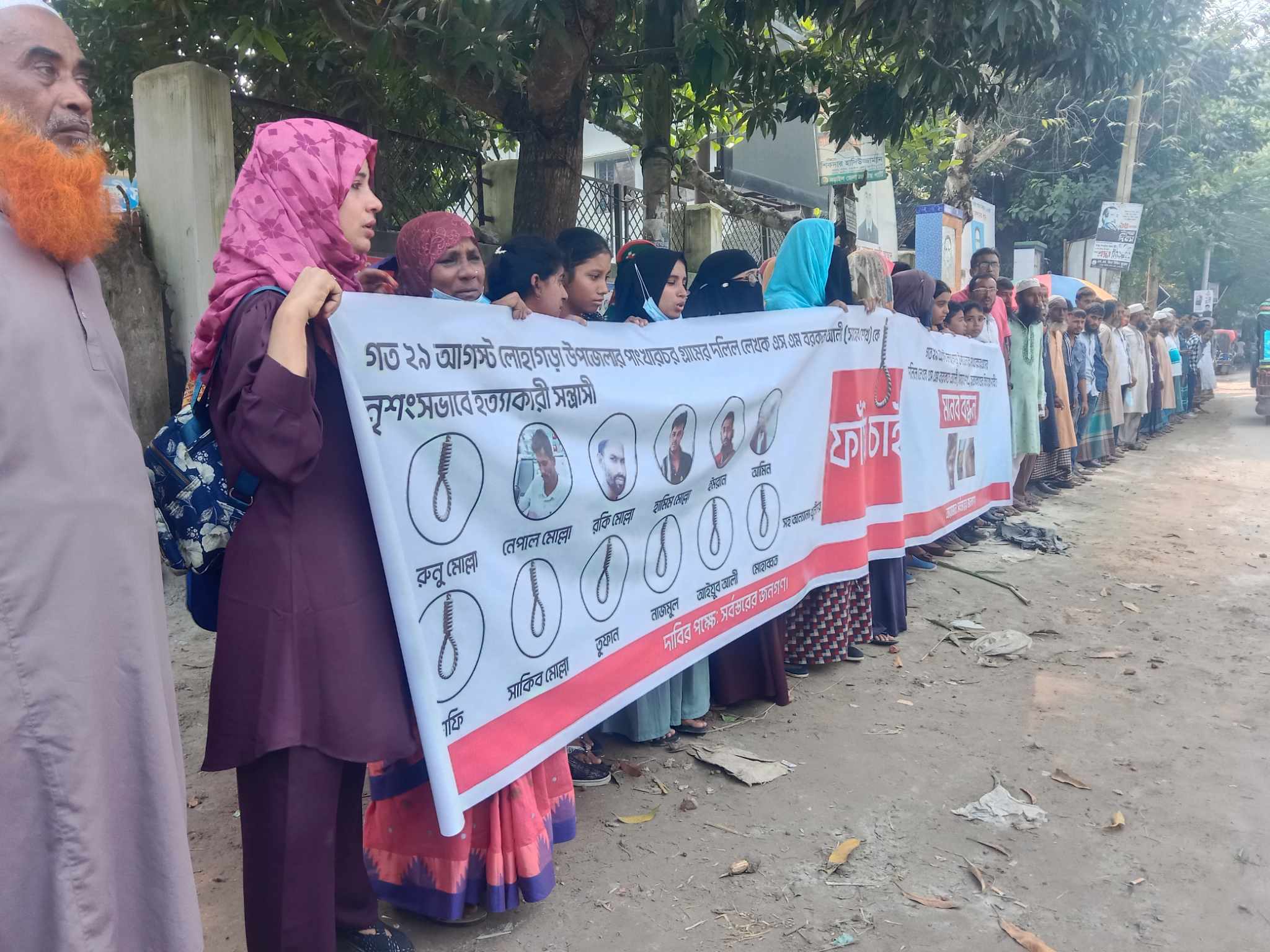 নড়াইলের লোহাগড়ায় দলিল লেখক এস এম বরকত আলী হত্যা ঘটনায় বিচারের দাবীতে মানববন্ধন অনুষ্ঠিত হয়েছে। ১২ অক্টোবর বৃহস্পতিবার বেলা সাড়ে ১১টায় নড়াইল আলাদত সড়কে মানববন্ধন অনুষ্ঠিত হয়। ঘন্টাব্যাপি মানববন্ধনে ইতনা ইউনিয়নের পাংখারচর এলাকার কয়েকশ নরনারী উপস্থিত অংশ নেন। এ সময় নিহত বরকত আলীর ভাগ্নী রুনা লাইলা, নিহত বরকতের স্ত্রী ফাতেমা খাতুন, মেয়ে ফারজানা খানম, ভাতিজা সাজ্জাদুর রহমান পলাশ ও ভাগ্নে রাজশাহী বিশ^বিদ্যালয়ের প্রফেসর কাজী জাহিদুর রহমান বক্তব্য দেন। বক্তব্য চলাকালে আসামী পক্ষের নাদিরা নামের এক মহিলা উস্কানি মুলক বক্তব্য দিতে থাকে এ সময় কিছুটা বিশৃঙ্খলা দেখা দেয়। উপস্থিত জনগনের হস্তক্ষেপে পরিস্থিতি নিয়ন্ত্রনে আসে। পরে আবার মানববন্ধনে কার্যক্রম শুরু হয়। এ সময় বক্তরা বলেন, হত্যাকারীরা আইনে ফাকফোকড় দিয়ে সপ্তাহ যেতে না যেতেই আদালত থেকে জামীনে মুক্ত হয়ে আমাদের জিম্মি করে রেখেছে। আমরা এই জিম্মিদশা থেকে মুক্তি চাই। আসামীরা নানা ভাবে হুমকি দামকি দিচ্ছে। যাতে আমরা মামলা তুলে ফেলি। এমনকি মানববন্ধনে এসেও হুমকি দিচ্ছে। নিহতের স্ত্রী ফাতেমা খাতুন বলেন, সবসময় আমাদের হুমকি দিয়ে যাচ্ছে আমরা মানববন্ধন করতে এসেছি এখানে এসে হুমকি দিচ্ছে। আমরা এর সুষ্ট বিচার চাই। নিহতের ভাগ্নে কাজী জাহিদ বলেন, ভুক্তভোগীরা নিজ বাড়িতে ঘুমাতে পারছেনা । খুনের মামলার আসামী কি করে এক সপ্তাহের মধ্যে আইনের ফাকফোকড়ে জামিন হয়ে গেল। আমার সরকারের কাছে দাবী এই খুনের যেন সঠিক বিচার হয়। খুনিরা যেন কোনভাবেই ক্ষমা না পাই। আর পরিবারের নিরাপত্তার দাবী জানায়। উলেখ্য, গত ২৯ আগস্ট বিকেলের দিকে নড়াইলের লোহাগড়া উপজেলার ইতনা ইউনিয়নের পাংখারচর এলাকায় জমি সংক্রান্ত বিরোধের জের ধরে প্রতিপক্ষের হাতুড়ি ও লাঠির আঘাতে পাংখারচর গ্রামের মৃত আলফু শেখের ছেলে এস এম বরকত আলী ওরফে সাহেব নিহত হন।