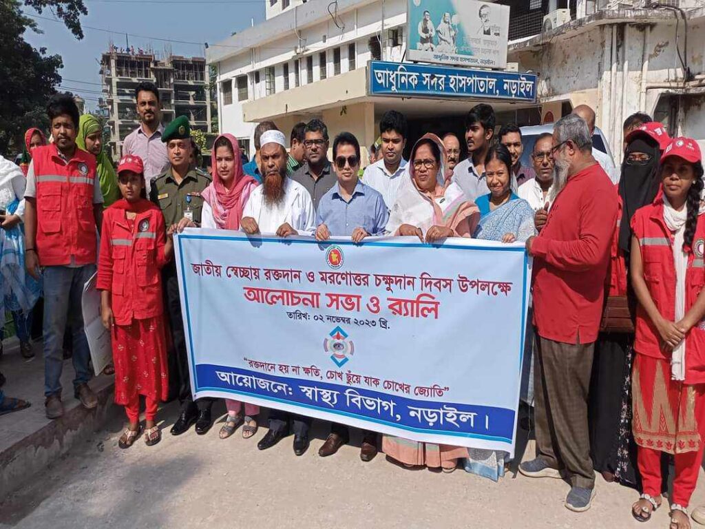 নড়াইল প্রতিনিধি ‘”রক্ত দানে হয় না ক্ষতি, চোখ ছুঁয়ে যাক চোখের জ্যোতি’, এ স্লোগানকে স্বেচ্ছায় রক্তদান ও মরণোত্তর চক্ষুদান দিবস নড়াইলে পালিত হয়েছে। বৃহস্পতিবার (২ নভেম্বর) দিবস উপলক্ষে জেলা স্বাস্থ্য বিভাগ, নড়াইলের আয়োজনে র্যালি, আলোচনা সভা ও স্বেচ্ছায় রক্তদান কর্মসূচি পালিত হয়। নড়াইল আধুনিক সদর হাসপাতালে আলোচনা সভা শেষে স্বেচ্ছায় রক্তদান কর্মসূচি পালিত হয়। এর আগে একটি র্যালি হাসপাতাল চত্বর থেকে শুরু হয়ে শহরের প্রধান প্রধান সড়ক প্রদক্ষিণ শেষে একই স্থানে এসে শেষ হয়। সিভিল সার্জন ডাঃ সাজেদা বেগমের সভাপতিত্বে জেলা প্রশাসক মোহাম্মদ আশফাকুল হক চৌধুরী , অতিরিক্ত জেলা প্রশাসক (সার্বিক) শ্বাশতী শীল, নড়াইল পৌরসভার মেয়র আঞ্জুমান আরা, আধুনিক সদর হাসপাতালের তত্ত্বাবধায়ক ডাঃ আব্দুল গাফফার, বাংলাদেশ আনসার ও গ্রাম প্রতিরক্ষা বাহিনী, নড়াইলের জেলা কমাড্যান্ট বিকাশ চন্দ্র দাস, নড়াইল প্রেসক্লাবের সভাপতি অ্যাডঃ আলমগীর সিদ্দিকী, সরকারি কর্মকর্তা, ডাক্তার, নার্স ও ক্লিনিক মালিকসহ সংশ্লিষ্টরা এ সময় উপস্থিত ছিলেন। সভায় বক্তরা বলেন, রক্ত দানে কোনো ক্ষতি হয় না, প্রতিটি মানুষ তিন থেকে চার মাস পর রক্ত দিতে পারে, এ কার্যক্রমে সকলে এগিয়ে আসা উচিত, এছাড়াও মরণোত্তর চক্ষুদানে কোনো সমস্যা হয় না, চক্ষু দান করলে, ঐ চক্ষুর মাধ্যমে একজন দৃষ্টিহীন মানুষ তার দৃষ্টি শক্তি ফিরে পায়। তাই সকলকে এ বিষয়ে সচেতন হবে, এ সব কার্যক্রমে এগিয়ে আসতে হবে।