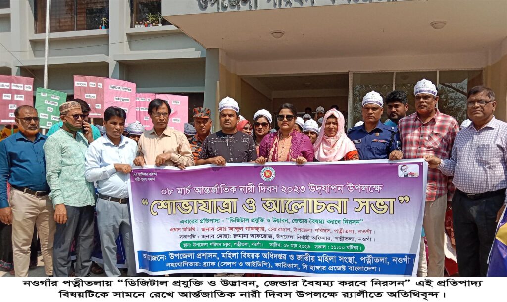 মিজানুর রহমান, পত্নীতলা (নওগাঁ) প্রতিনিধি- নওগাঁর পত্নীতলায় “ডিজিটাল প্রযুক্তি ও উদ্ভাবন, জেন্ডার বৈষম্য করবে নিরসন” এই প্রতিপাদ্য বিষয়টিকে সামনে রেখে উপজেলা প্রশাসন, উপজেলা মহিলা বিষয়ক অধিদপ্তর ও জাতীয় মহিলা সংস্থা পত্নীতলায়র আয়োজনে এবং এনজিও সংস্থা ব্রাক, দ্য হাঙ্গার প্রজেক্ট, কারিতাস এর যৌথ সহযোগীতায় আর্ন্তজাতিক নারী দিবস/২৩ পালিত হয়েছে।