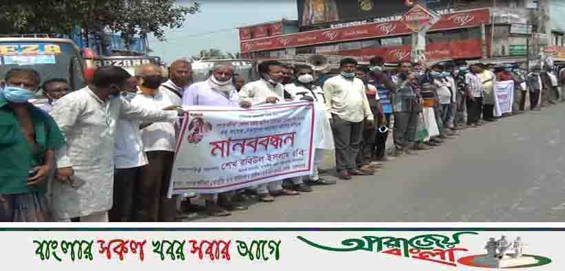 মানববন্ধনে জেলা মোটর শ্রমিক ইউনিয়নের সাবেক সভাপতি শেখ রবিউল ইসলামের সভাপতিত্বে বক্তব্য দেন- জেলা নাগরিক কমিটির যুগ্ম সদস্য সচিব আলী নুর খান বাবলু, শ্রমিক নেতা মখছুর রহমান, মনিরুল ইসলাম, লিয়াকত হোসেন, মশিউর রহমান, আব্দুস সালাম, শেখ শফিউল ইসলাম, সিরাজুল ইসলাম, মিরাজুল ইসলাম, মোরশেদ হোসেন, জুলফিকার হোসেন সবুজ প্রমুখ।
