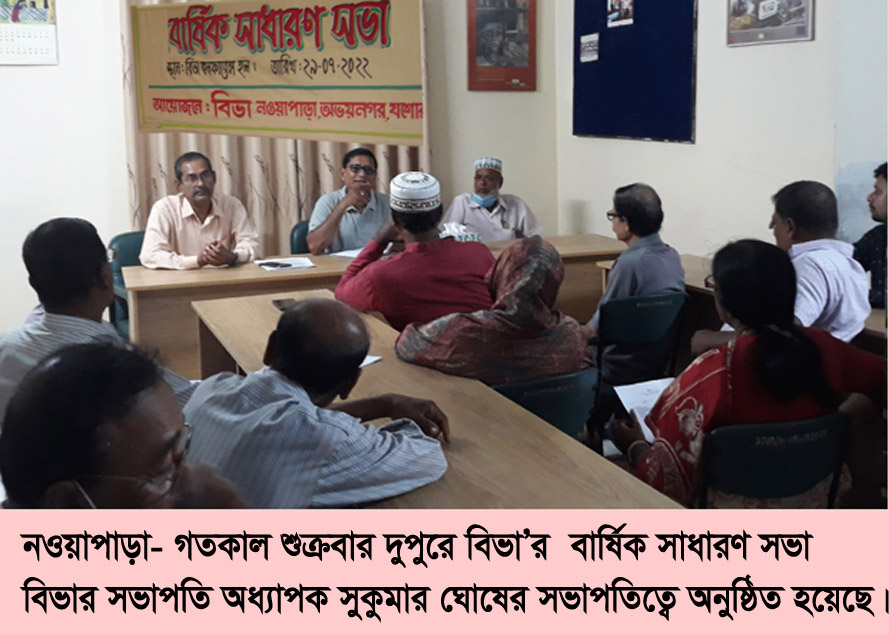 গতকাল শুক্রবার দুপুরে বিভা’র বার্ষিক সাধারণ সভা ও বাজেট পেশ অনুষ্ঠান বিভা’র সভাপতি অধ্যাপক সুকুমার ঘোষের সভাপতিত্বে অনুষ্ঠিত হয়েছে। সভায় ১০ কোটি ৬৬ হাজার ৫ শ’ টাকার বাজেট অনুমোদন করা হয়েছে। উপস্থিত ছিলেন, সহ সভাপতি মো: ফিরোজ উদ্দিন,সদস্য সচিব তীর্থ শংকর মিত্র,কোষাধ্যক্ষ অশোক কুমার হালদার ,সদস্য মো: রবিউল আলম,গীতা রানী মজুমদার, বিকাশ চন্দ্র পন্ডিত,মো: রুহুল কুদ্দুস,সুনীল কুমার দাস,অনিল কুমার পাল, রীতা ঘোষ,কনিকা দত্ত,মো: শাহীদুল ইসলাম, লুৎফুর নাহার রতœা, দীপংকর বসু, মো: কুদ্দুস আলী ফকির, মো; হাদিউজ্জামান,সুজিত কুমার রায়, সাফিয়া খানম,নাজমা খাতুন মুক্তা। বক্তারা স্বচ্ছতা,জবাবদিহিতা ও মিতব্যয়িতার সাথে সেবা কার্যক্রম পরিচালনার উপর গুরুত্বারোপ করেন।
