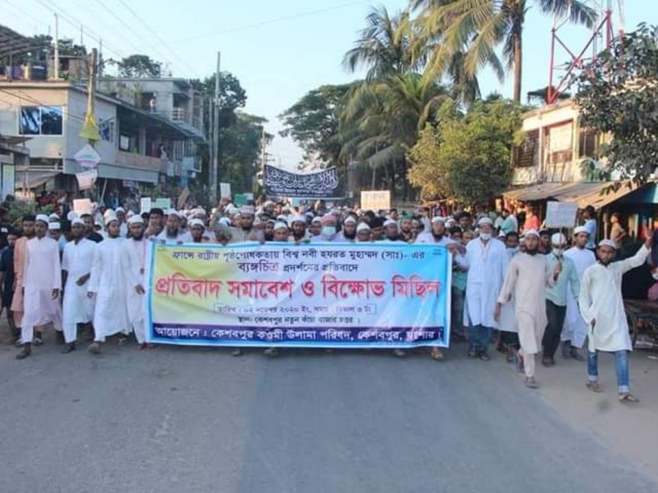 ফ্রান্সে রাষ্ট্রীয় পৃষ্ঠপোষকতায় বিশ্ব নবী হযরত মুহাম্মদ (সাঃ) এর ব্যঙ্গচিত্র প্রদর্শনের প্রতিবাদে যশোরের কেশবপুরে কওমী উলামা পরিষদের উদ্যোগে সমাবেশ ও বিক্ষোভ মিছিল অনুষ্ঠিত হয়েছে। সোমবার বিকালে কেশবপুর কাচাঁবাজার চত্বরে হাফেজ মাওলানা আসাদুজ্জামানের সভাপতিত্বে এবং মুফতি মুহাঃ হাবিবুল্লাহ’র সঞ্চালনায় প্রতিবাদ সমাবেশে বক্তব্য রাখেন, লাউড়ি কামিল মাদ্রাসার মুহাদ্দিস জালাল উদ্দিন, মাওঃ আব্দুর রাজাক, মাওঃ সিরাজুল ইসলাম, মাওঃ আবু মুসা সালিম, মাওঃ শফিকুল ইসলাম সাহেব, হাফেজ মোশারাফ, হাসান ফারুক প্রমুখ। সমাবশে থেকে ফ্রান্স সরকার কর্তৃক মুসলিম দেশগুলোর সরকার প্রধানদের কাছে ক্ষমা চাওয়ার আহবান জানানো হয়। এসময় ফ্রান্স সরকার কর্তৃপক্ষ ক্ষমা না চাওয়া পর্যন্ত বক্তারা বাংলাদশে সরকারের কাছে ফ্রান্সের সকল পণ্য র্বজন করা ও তাদের সাথে সমস্ত কূটনৈতিক সর্ম্পক ছিন্ন করার দাবী জানান। অন্যদিকে সোমবার আছরের নামাজ শেষে কেশবপুর উলামা পরষিদের পরচিালনা কমিটি ও মুসলিম জনতার আয়োজনে কেশবপুর কাচাঁবাজার চত্বর হতে একটি বিক্ষোভ মিছিল বাজারের বিভিন্ন সড়ক প্রদক্ষিণ করে একই স্থানে এসে শেষ হয়।