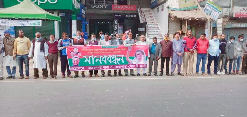 স্টাফ রিপোর্টার : যশোর জেলার অভয়নগর থানার শিল্প বানিজ্য ও বন্দর নগরী নওয়াপাড়া বাজারে সম্পুর্ন ব্যার্থ প্রধান নির্বাচন কমিশনারের পদত্যাগের দাবিতে সোমবার সকালে নওয়াপাড়া পৌর বিএনপির উদ্বোগে সংগঠনের কেন্দ্রিয় কর্মসূচি মানববন্ধন অনুষ্ঠিত হয় । নওয়াপাড়া বাজারে মানববন্ধনে প্রধান অথিতি হিসাবে বক্তব্য রাখেন বিএনপির কেন্দ্রীয় কমিটির সদস্য ফারাজী মতিয়ার রহমান,বিশেষ অথিতি হিসাবে বক্তব্য রাখেন যশোর জেলা বিএনপির আহবায়ক কমিটির সদস্য আবু নইম মোড়ল,কাজী গোলাম হায়দার ডাবলু ,মোঃ রেজাউল করিম মোল্যা, বিএনপি নেতা আঃ মজিদ বিশ্বাস, নওয়াব আলী সরদার, রেজাউল ইসলাম মোল্যা, হাবিবুর রহমান খোকন, ইমাদ উদ্দিন গাজি, ফিরোজ আলম, রবিউল ইসলাম,আঃ গফফার, অবেদ আলি,সফিয়ার রহমান, মোঃ মুজিবর রহমান, কৃষক দল নেতা হাবিব বেগ, বিল্লাল মোল্যা, যুদলনেতা মাসুদ রানা,মনিরুল আলম ফারাজি, আব্দুর রশিদ, কামাল হোসেন ,আফজাল হোসেন, মিঠু গাজি, ঝন্টু পাটয়ারী, তরফদার বাশির উদ্দিন,ইউসুফ আলি মোঃ জোবায়ের,গোলাম রসুল, সেলিম হোসেন, ,অভয়নগর উপজেলা স্বেচ্ছাসেবক দলের সিনিয়র যুগ্ন আহবায়ক, নওয়াপাড়া কলেজ ছাত্র সংসদের সাবেক জিএস মোল্যা হাবিবুর রহমান (হাবিব), স্বেচ্ছাসেবক দল নেতা মাহাবুবুর রহমান ডাঃ জাকির, হাফিজুর রহমান মুরাদ, মোঃ সাগর শেখ, সুজন ফারাজী,ছাত্রদল নেতা সাইফুল ইসলাম, মোঃ মাসুদ রানা তুহিন, তরফদার নাজির উদ্দিন ,তাউহীদ আল ওসামা, আল আমিন হোসেন, মামুন হোসেন, রিয়াদ গুলদার, প্রমুখ নেতৃবৃন্দ
