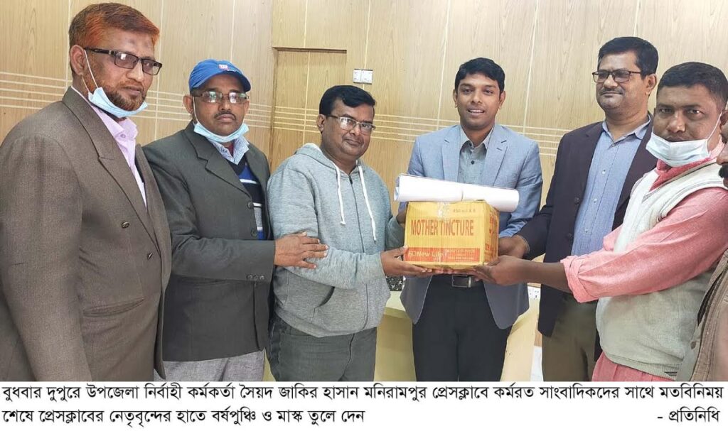 যশোরের মনিরামপুর উপজেলা নির্বাহী কর্মকর্তা সৈয়দ জাকির হাসান বুধবার দুপুরে মনিরামপুর প্রেসক্লাবে কর্মরত সকল সাংবাদিকদের সাথে মতবিনিময় করেছেন। নির্বাহী কর্মকর্তার অফিস কক্ষে অনুষ্ঠিত মতবিনিময় সভায় তিনি জানান, মুজিববর্ষ উপলক্ষে মনিরামপুরে ২’শ ৬২ জন ভূমিহীন বা গৃহহীন হতদরিদ্র পরিবারের মাঝে জমিসহ ঘর বরাদ্দ দেয়া হবে। যা আগামী ২০শে জানুয়ারী মাননীয় প্রধানমন্ত্রী শেখ হাসিনা ভিডিও কনফারেন্সের মাধ্যমে উদ্বোধন করবেন। এছাড়া আগামী ৩০শে জানুরয়ারি উৎসবমুখর পরিবেশে মনিরারমপুর পৌরসভা নির্বাচন অনুষ্ঠিত হওয়ার জন্য সাংবাদিকদের নিকট সহযোগীতা কামনা করেন। উপজেলার প্রত্যন্ত অঞ্চলসহ সকল অবহেলিত জনপদের স্বচিত্র প্রতিবেদন পত্রিকার মাধ্যমে তুলেধরা এবং সরকারের সকল উন্নয়নমূলক কর্মকান্ড প্রচারের জন্য উদাত্ত আহবান করা হয়। মতবিনিময় শেষে প্রেসক্লাবের নেতৃবৃন্দের হাতে ২০২১ সালের বর্ষপুঞ্চি ও কিছু মাস্ক তুলে দেন নির্বাহী কর্মকর্তা সৈয়দ জাকির হাসান। এ সময় মনিরামপুর প্রেসক্লাবের সাবেক নেতৃবৃন্দ ছাড়াও বর্তমান কার্যকর কমিটির সভাপতি মোঃ ফারুক আহমেদ লিটন, সহ-সভাপতি জি. এম ফারুক আলম, সম্পাদক মোতাহার হোসেন, যুগ্ম-সম্পাদক হারুন-অর-রশিদ সেলিম, আসাদুজ্জামান রয়েল, সাংগঠনিক সম্পাদক এস. এম সিদ্দিকুর রহমান’সহ সকল সাংবাদিকগণ উপস্থিত ছিলেন।