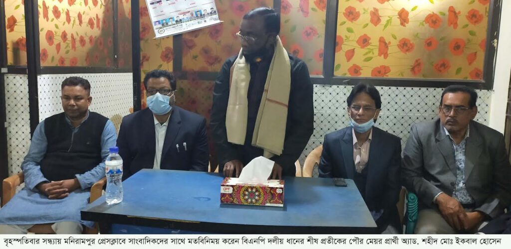 প্রেসক্লাবের সম্পাদক মোতাহার হোসেনের সঞ্চলায় মতবিনিময় সভায় মেয়র প্রার্থী অ্যাড. শহীদ মোঃ ইকবাল হোসেন বলেন, আগামী ৩০শে জানুয়ারী মনিরামপুর পৌরসভার নির্বাচন অনুষ্ঠিত হবে। দলীয় সিদ্ধান্ত এবং জনগনের উৎসাহে আমি তৃতীয় বারের মতো নির্বাচনে ধানের শীষ প্রতীকের প্রার্থী হয়েছি। পূর্বেও সততার সাথে দুইবার পৌরসভায় মেয়র হিসেবে দায়িত্ব পালন করেছি।