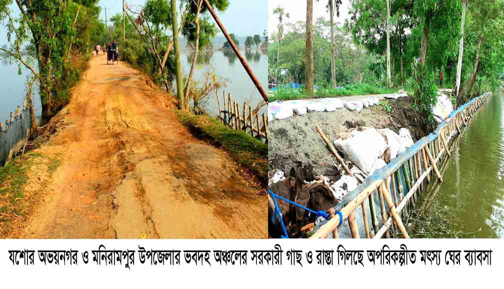 প্রিয়ব্রত ধর,ভ্রাম্যমান প্রতিনিধি : যশোর অভয়নগর ও মনিরামপুর উপজেলার ভবদহ অঞ্চলের সরকারী গাছ ও রাস্তা গিলছে অপরিকল্পিত মৎস্য ঘের ব্যাবসা। ভবদহ অঞ্চল জলাবদ্ধ হওয়াই বছরের বেশির ভাগ সমায়ে পানি থাকে অত্র অঞ্চলের বীল গুলোতে। ফলে যত্র তত্র গড়ে উঠেছে মৎস্য ঘেরের ব্যাবসা। তবে বেশির ভাগ ঘেরের পাড় তৈরি হয়েছে সরকারী রাস্তা ব্যবহার