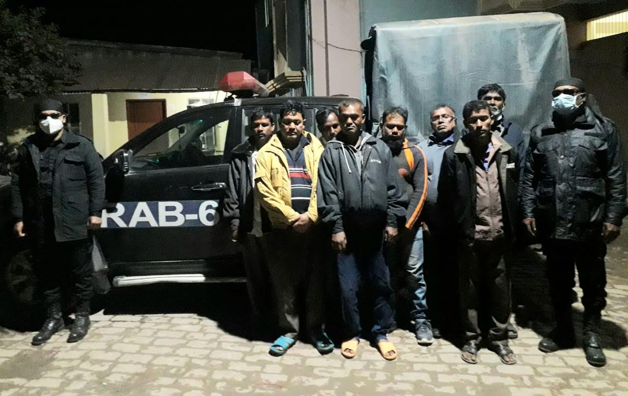 প্রেস বিজ্ঞপ্তিঃ যশোরে র্যাবের অভিযানে ৮ জুয়ারী গ্রেফতার হয়েছে সোমবার ০৪/০১/২০২১ তারিখ ২৩.৩০ ঘটিকার সময় র্যাব-৬, সিপিসি-৩, যশোর ক্যাম্পের ভারপ্রাপ্ত কোম্পানি কমান্ডার লেঃ এম সারোয়ার হুসাইন, (এক্স), বিএন এর নেতৃত্বে একটি আভিযানিক দল গোপন সংবাদের ভিত্তিতে যশোর জেলার কোতয়ালী মডেল থানাধীন আর এন রোডের পিকআপ স্ট্যান্ডের মধ্যে খোলা জায়গায় অভিযান পরিচালনা করে (ক) ১২ (বার) সেট তাস, (খ) নগদ টাকা-৩২,৩২০ টাকা, (গ) ০৮ টি মোবাইল ও ০৮ টি সীমসহ আসামী ১। মোঃ জাহাঙ্গীর (৩৫), পিতা- মৃত মতলেব মোল্লা, সাং-গাইদগাছী ২। মোঃ ফরিদ (৩৮), পিতা-মৃত মোকাম মোল্লা, সাং- গুরুলিয়া ৩। মোঃ বাদশা (৪৮), পিতা- মৃত মকবুল হোসেন, সাং- নলডাঁঙ্গা ৪। মোঃ আজিজ (৪৫), পিতা-মৃত একাব্বর গাজী, সাং-আশ্রম মোড় ৫। শ্রী বিকাশ সরকার (৫৫),পিতা- মৃত শান্তিরাম সরকার, সাং-ষষ্ঠীতলা ৬। সহিদ খাঁন (৫০), পিতা- আঃ আজিজ, সাং-বেজপাড়া, ৭। মোঃ ছোটন (৫৮), পিতা- পিতা মৃত শেখ রুস্তম, সাং-বারন্দী পাড়া, সর্ব থানা-কোতয়ালী, ৮। মোঃ আঃ লতিফ (৩০) পিতা-শাহজাহান মোল্লা থানা-কেশবপুর সর্ব জেলা-যশোরদেরকে জুয়া খেলারত অবস্থায় হাতে নাতে গ্রেফতার করে। আসামীদেরকে ১৮৭৬ সালের জুয়া আইনের ৪ ধারা অনুসারে যশোর জেলার কোতয়ালী মডেল থানায় মামলা রুজু করা হয়েছে।