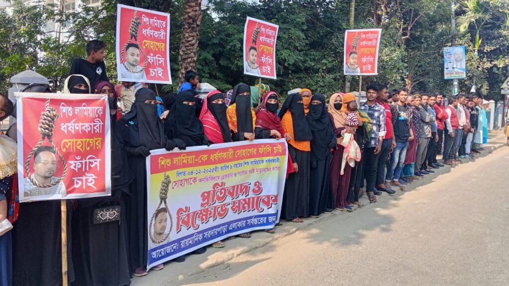 যশোরে বছরের শিশু ধর্ষণের প্রতিবাদে এবং অভিযুক্ত ধর্ষক সোহাগের দ্রুত গ্রেফতার ও ফাঁসির দাবিতে বিক্ষোভ করেছে গ্রামবাসী। বুধবার ১০ ডিসেমবার দুপুরে তারা শহরে এক বিশাল বিক্ষোভ মিছিল ও মানববন্ধন কর্মসূচির আয়োজন করে। এলাকাবাসীর উদ্যোগে আয়োজিত বিক্ষোভ মিছিলটি শহরের বিভিন্ন এলাকা প্রদক্ষিণ করে অবশেষে প্রেসক্লাব যশোরের সামনে এসে শেষ হয়। সেখানে এক মানববন্ধন ও বিক্ষোভ সমাবেশে অংশগ্রহণ করেন বহু মানুষ।