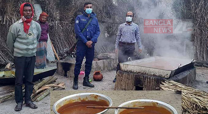 অপরাজেয় বাংলা ডেক্স : খেজুর রসে চিনি, চুন, ফিটকিরি ও সরিষার তেল মিশিয়ে জ্বাল দিয়ে তৈরি করা হচ্ছে ভেজাল গুড়।