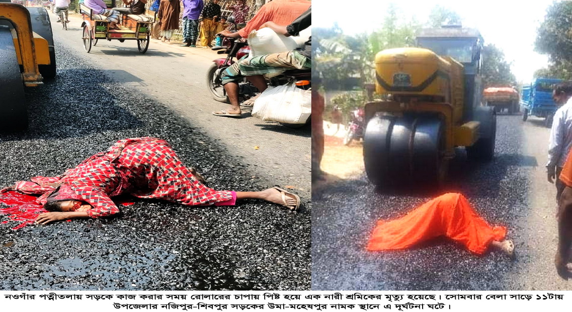 পতœীতলায় উপজেলার নজিপুর-শিবপুর সড়কের উমা-মহেষপুর নামক স্থানে সোমবার বেলা সাড়ে ১১টায় সড়কে কাজ করার সময় রোলারের চাপায় পিষ্ট হয়ে এক নারী শ্রমিকের মৃত্যু হয়েছে।