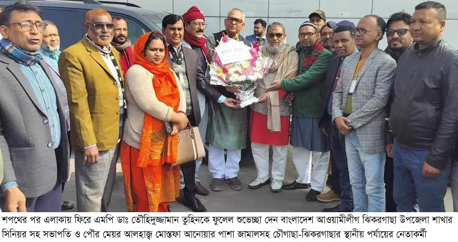 আফজাল হোসেন চাঁদ, ঝিকরগাছা : দ্বাদশ জাতীয় সংসদ নির্বাচনে ৮৬ যশোর-২(চৌগাছা-ঝিকরগাছা) আসনে বাংলাদেশ আওয়ামীলীগের দলীয় মনোনয়ন নৌকা মার্কার বিজয়ী প্রার্থী, নবনির্বাচিত জাতীয় সংসদ সদস্য, ঢাকা স্কয়ার হসপিটালের কার্ডিওলজী বিভাগের সিনিয়র কনসালটেন্ট ও ঝিকরগাছার দৌলতুন্নেছা-ওহাব ফাউন্ডেশনের প্রতিষ্ঠাতা চেয়ারম্যান ডাঃ মোঃ তৌহিদুজ্জামান তুহিন সংসদ সদস্যের শপথ নেওয়ার পর এলাকায় ফিরতেই যশোর বিমান বন্দর থেকে নেমে বাহিরে আসা মাত্রই পূর্বে থেকে অপেক্ষারত নেতাকর্মীরা তাকে ফুলেল শুভেচ্ছা দিয়ে জয় বাংলা ও জয়বন্ধু ধ্বনিতে মুখোরিত করে যশোর বিমান বন্দর। এসময় সকলের উদ্দেশ্যে তিনি বলেন, উন্নয়ন ও গণতন্ত্রের পক্ষে জনগণের রায়,স্মার্ট বাংলাদেশ বিনির্মাণের লক্ষ্যে নৌকার বিজয়। নৌকা প্রতীকের প্রতি প্রাণপ্রিয় যশোর-২ বাসীর আস্থা ও ভালোবাসায় ভোটের মাধ্যমে গণতন্ত্রের বিজয় হয়েছে। এই বিজয়কে পুঁজি করে আমি মাননীয় প্রধানমন্ত্রী জননেত্রী শেখ হাসিনার ভিশন-২০৪১ স্মার্ট বাংলাদেশ বিনির্মাণের একজন কর্মী। নান্দনিক স্মার্ট চৌগাছা-ঝিকরগাছা গড়ে তোলার লক্ষে আমি একজন কারিগর হয়ে সবার প্রত্যাশাগুলোকে বাস্তবে রূপদান করবো ইনশাআল্লাহ্। সবাই আমার জন্য দোয়া করবেন।