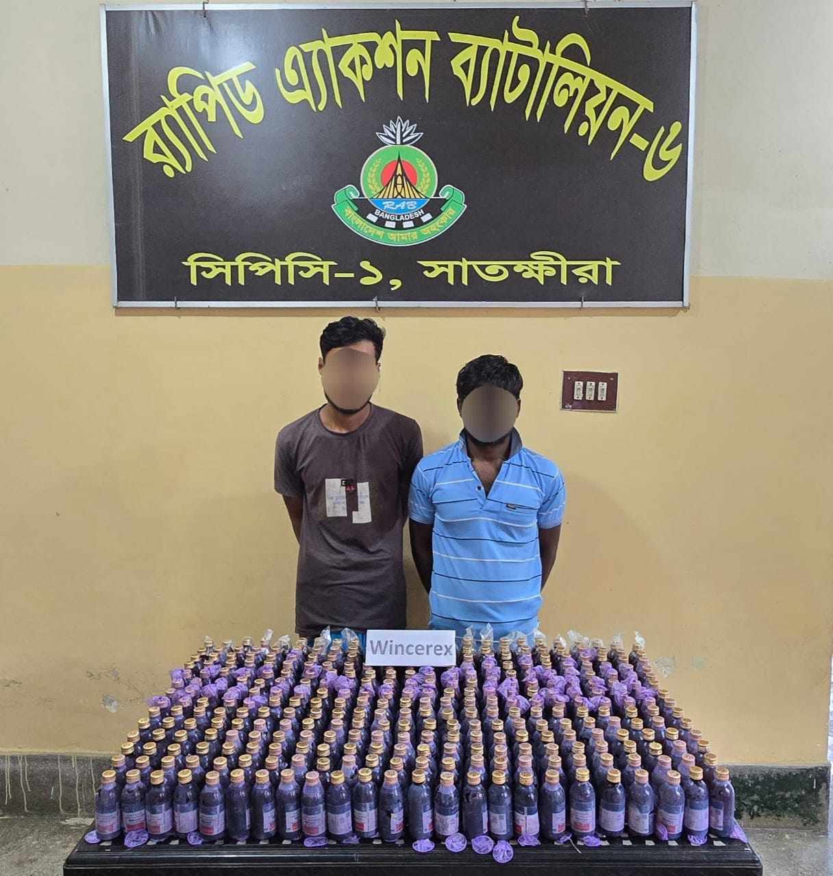 সাতক্ষীরা র্যাব-৬ ভোমরা ইউনিয়নের মাঝেরপাড়া এলাকায় অভিযান চালিয়ে ৩৫৮ পিচ ফেনসিডিল ওwincerex নেশা জাতীয় দ্রব্যসহ ২ জন মাদক কারবারিকে আটক করে র্যাব-৬।