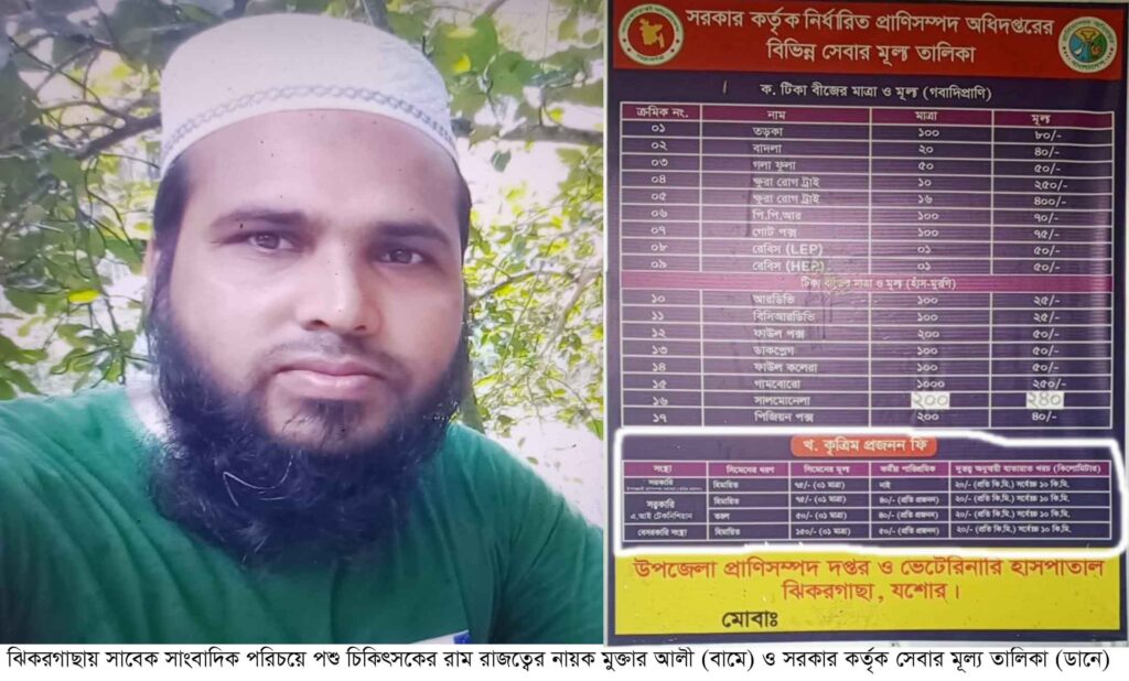 আফজাল হোসেন চাঁদ, ঝিকরগাছা : যশোরের ঝিকরগাছা উপজেলায় সাবেক সাংবাদিক পরিচয় দিয়ে পশু চিকিৎসক মুক্তার আলী চালাচ্ছে রাম রাজত্ব। ক্রমাগতই ঘটনাটি ঘটে চলছে ৬নং ঝিকরগাছা ইউনিয়ন এলাকায় সরকার কতৃক নির্ধারিত ফি ৭৫টাকা এর বাহিরে গিয়ে তিনি ১২শত টাকা করে বিক্রয় করে সাধারণ মানুষের কাছ থেকে লুটে নিচ্ছে হাজার-হাজার টাকা। তিনি পদ্মপুকুর গ্রামের মৃত. নজরুল ইসলামের ছেলে।