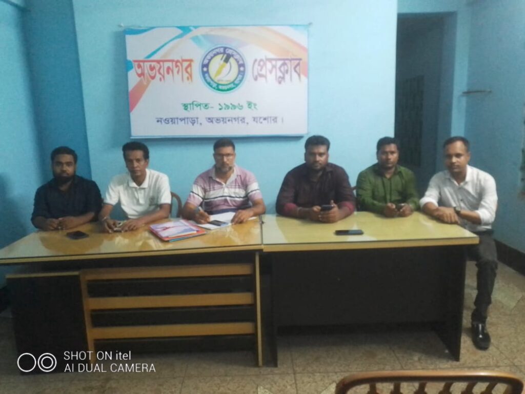 গতকাল বৃহস্পতিবার ২৪ জুলাই সন্ধায় নওয়াপাড়া বাজারে অভয়নগর প্রেস ক্লাবের সভা কক্ষে ক্লাবের সভাপতি সৈয়দ রিপন এর সভাপতিত্বে ওই সভায় উপস্থিত থেকে বক্তব্য রাখেন, অভয়নগর প্রেস ক্লাবের সাধারণ সম্পাদক আশরাফুল ইসলাম মাসুম, সহ-সভাপতি আমিরুল ইসলাম, দপ্তর সম্পাদক কামাল হোসেন খাঁন, সাহিত্য ও প্রকাশনা সম্পাদক আবুল বাশার জীবন, সদস্য মশিউর রহমান, তৈহদুর রহমান প্রমুখ।